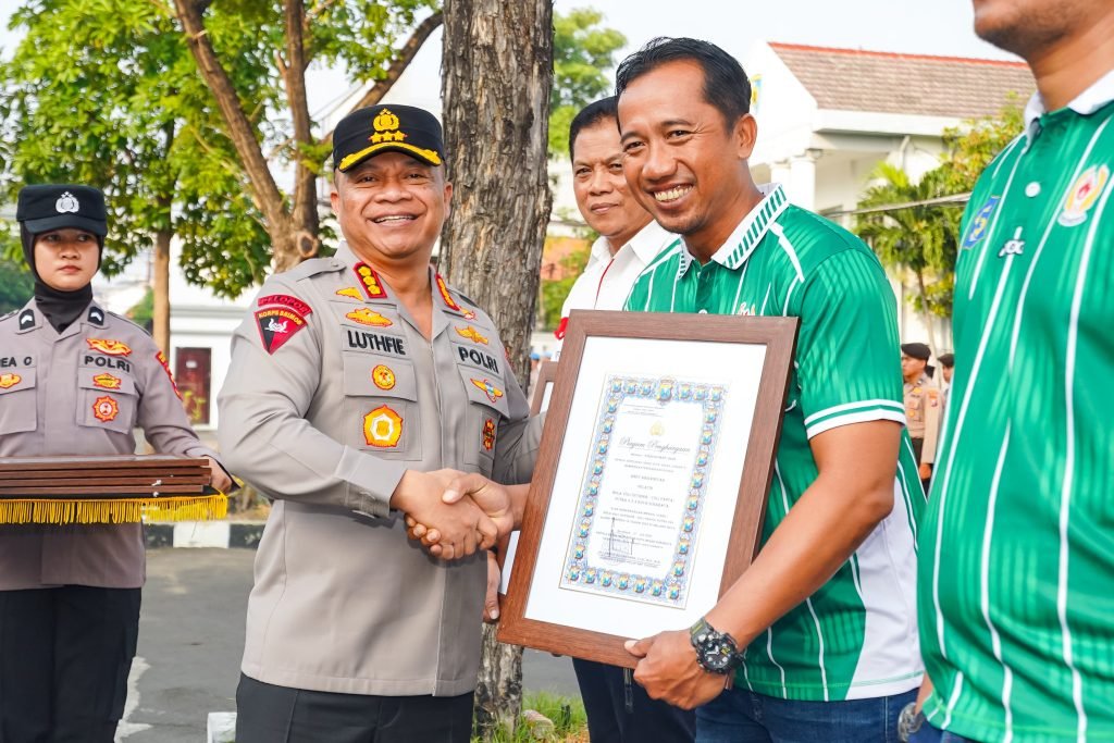 SURABAYAONLINE.CO, Surabaya – Kapolresta Surabaya yang juga menjabat sebagai Ketua Umum Pengurus Kota (Pengkot) PBVSI Surabaya, Kombes Pol Dr. Lutfhie Sulistiawan, SIK, MH, M.Si, memberikan penghargaan kepada para atlet, pelatih bola voli indoor dan voli pantai asal Kota Surabaya, Senin (28/7/ 2025) di Lapangan B Polrestabes Surabaya, Jl. Taman Sikatan No. 1 Surabaya.