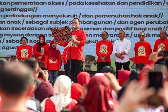 Dalam acara yang berlangsung meriah tersebut, Wali Kota Surabaya Eri Cahyadi memimpin seluruh peserta anak untuk membacakan Komitmen Bersama Partisipasi Semesta untuk Anak Surabaya Menuju Indonesia Emas 2045.