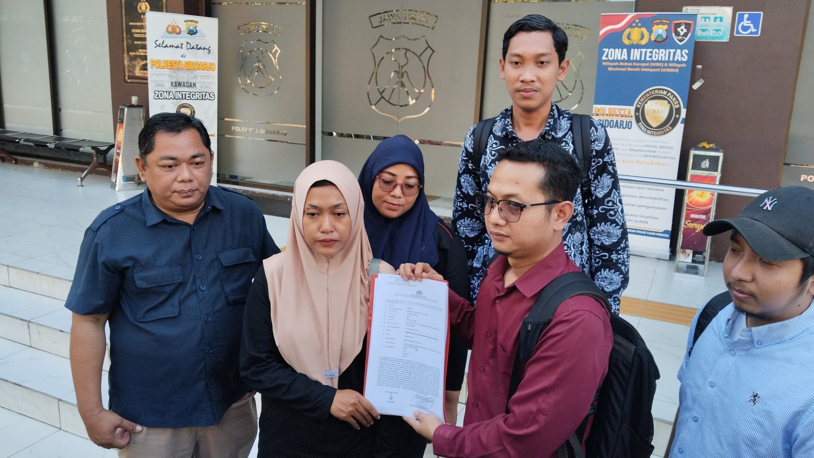 Dengan tangis, Siti Aini mendatangi SPKT Polresta Sidoarjo didampingi kuasa hukum Frendi Septi Fauzan,S.H dari Lembaga Bantuan Hukum (LBH) Damar Indonesia serta Ketua Java Corruption Watch (JCW), Sigit Imam Basuki,S.T pada Rabu (3/9/2025).