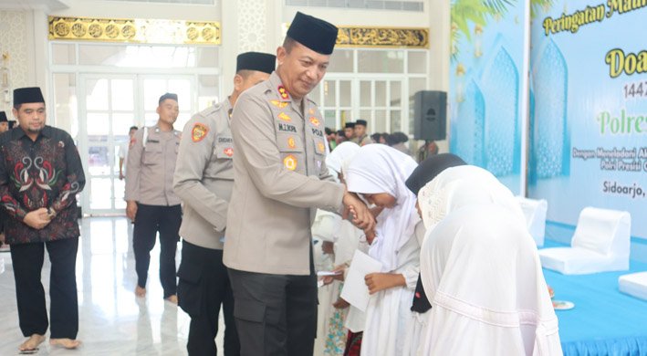 SURABAYAONLINE.CO – Polresta Sidoarjo menggelar peringatan Maulid Nabi Muhammad SAW 1447 H di Masjid Al Ikhlas Polresta Sidoarjo, Rabu (11/9/2025). Kegiatan ini dihadiri langsung oleh Wakapolresta Sidoarjo AKBP Muhammad Zainur Rofik, anggota dan ASN ini di isi pembacaan shalawat Nabi, pengajian agama, doa bersama serta pemberian santunan kepada anak yatim piatu.