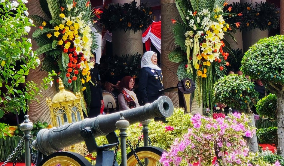 SURABAYAONLINE.CO – Gubernur Jawa Timur Khofifah Indar Parawansa menegaskan bahwa delapan dekade perjalanan Provinsi Jawa Timur bukan sekadar hitungan waktu, melainkan cerminan daya tahan, kerja keras, dan kreativitas warganya. Hal itu disampaikan Khofifah dalam pidatonya saat memimpin Upacara Peringatan Hari Jadi ke-80 Provinsi Jawa Timur di Gedung Negara Grahadi Surabaya, Minggu (12/10/2025).