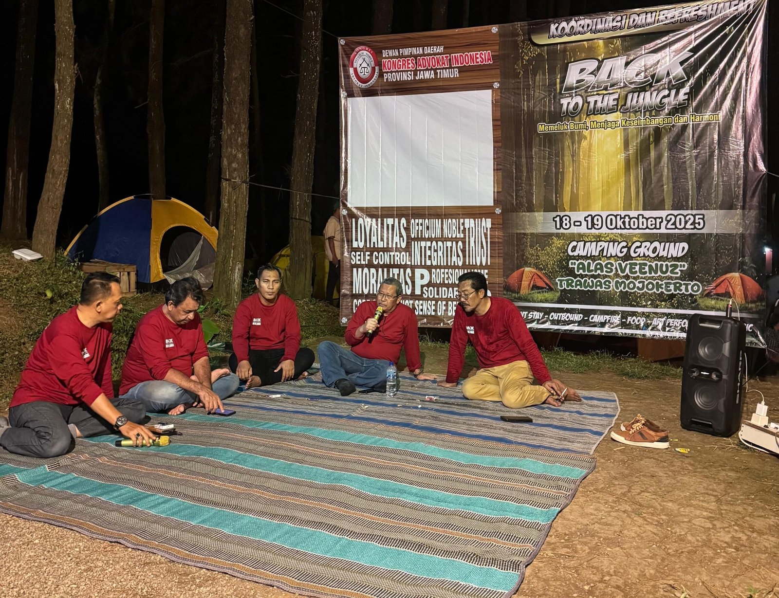 SURABAYAONLINE.CO- Dewan Pimpinan Daerah Kongres Advokat Indonesia (DPD K.A.I) Provinsi Jawa Timur menggelar kegiatan refreshment dan koordinasi pengurus selama dua hari, Sabtu–Minggu (18–19/10/2025), di Camping Ground Alas Veenuz, Trawas, Mojokerto.