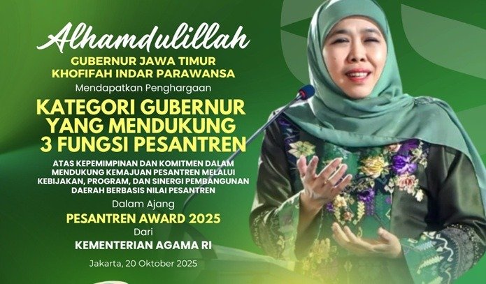 SURABAYAONLINE.CO – Komitmen Gubernur Jawa Timur, Hj. Khofifah Indar Parawansa, dalam membangun sumber daya manusia pesantren kembali mendapat apresiasi nasional. Pada Apel Hari Santri Provinsi Jawa Timur di Pondok Pesantren An-Nur II Bululawang, Malang, Gubernur Khofifah menerima Penghargaan Pesantren Award 2025 dari Kementerian Agama RI dalam kategori Gubernur Peduli Pesantren.