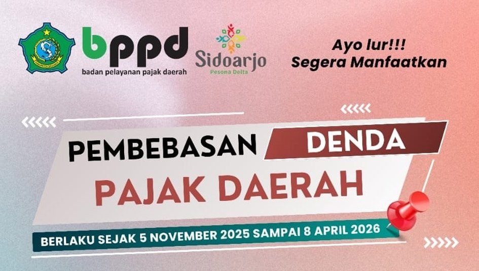 SURABAYAONLINE.CO – Program pembebasan sanksi administratif pajak daerah dilakukan Pemkab Sidoarjo. Program penggratisan denda keterlambatan pembayaran pajak daerah itu telah dimulai 5 November 2025 dan akan berakhir tanggal 8 April 2026. Kebijakan itu untuk mengintensifikasikan pajak daerah dan optimalisasi Pendapatan Asli Daerah/PAD Kabupaten Sidoarjo dari sektor Pajak Daerah,