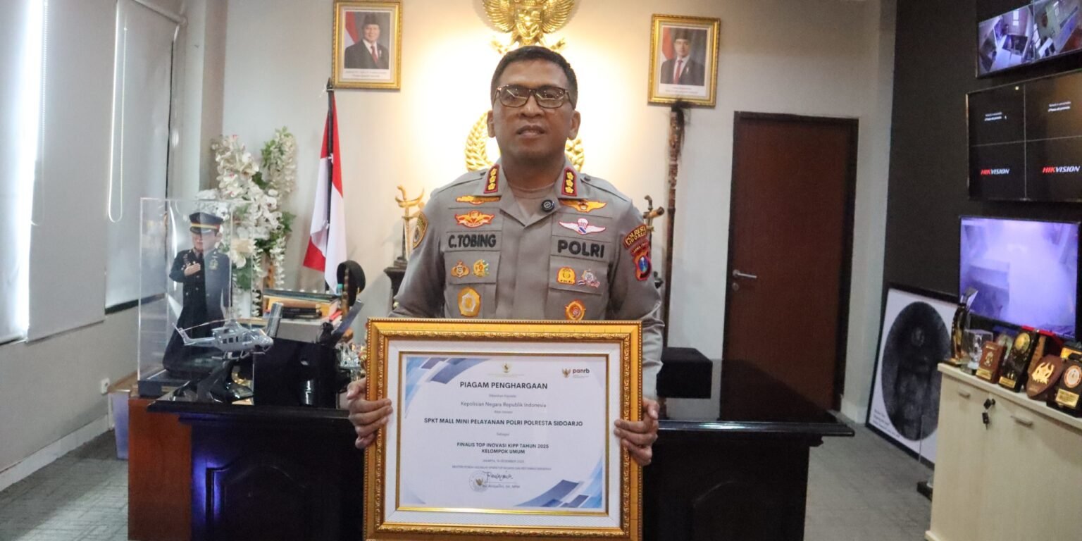 Kapolresta Sidoarjo Kombes. Pol. Christian Tobing, Rabu (14/1/2026), mengucapkan terima kasih atas diberikannya penghargaan dari Menteri PANRB atas inovasi SPKT Mall Mini Pelayanan Polri Polresta Sidoarjo, sebagai Finalis Top Inovasi KIPP tahun 2025 Kelompok Umum.