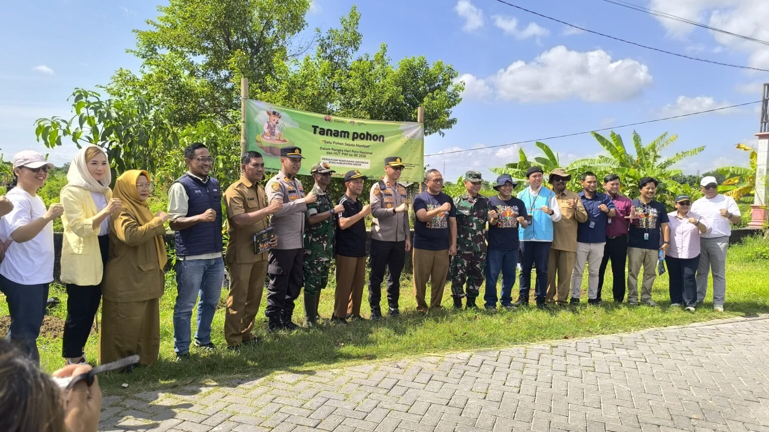 SURABAYAONLINE.CO – Kepedulian terhadap lingkungan kembali ditunjukkan Persatuan Wartawan Indonesia (PWI) Kabupaten Gresik. Bersama sejumlah instansi pemerintah daerah, dan perusahaan, PWI Gresik menggelar aksi penanaman ratusan pohon produktif di wilayah terdampak banjir Kali Lamong, di Desa Jono, Kecamatan Cerme.