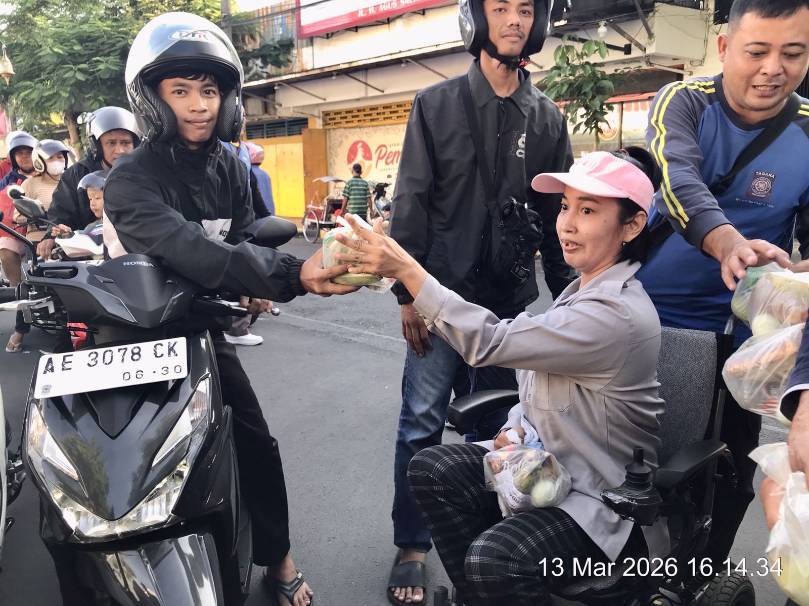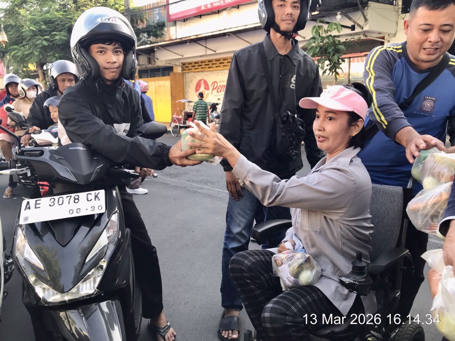 SURABAYAONLINE.CO – Puluhan penyandang disabilitas Kota Madiun, Jawa Timur, mencuri perhatian publik dengan turut turun ke jalan membagikan takzil. Mereka yang tergabung dalam Persatuan Penyandang Disabiitas Kota Madiun (PPDKM) itu mengambil lokasi di sisi Jalan Agus Salim, yang dimulai saat jelang berbuka puasa pukul 16.00 pada Jumat (13/03/2026).