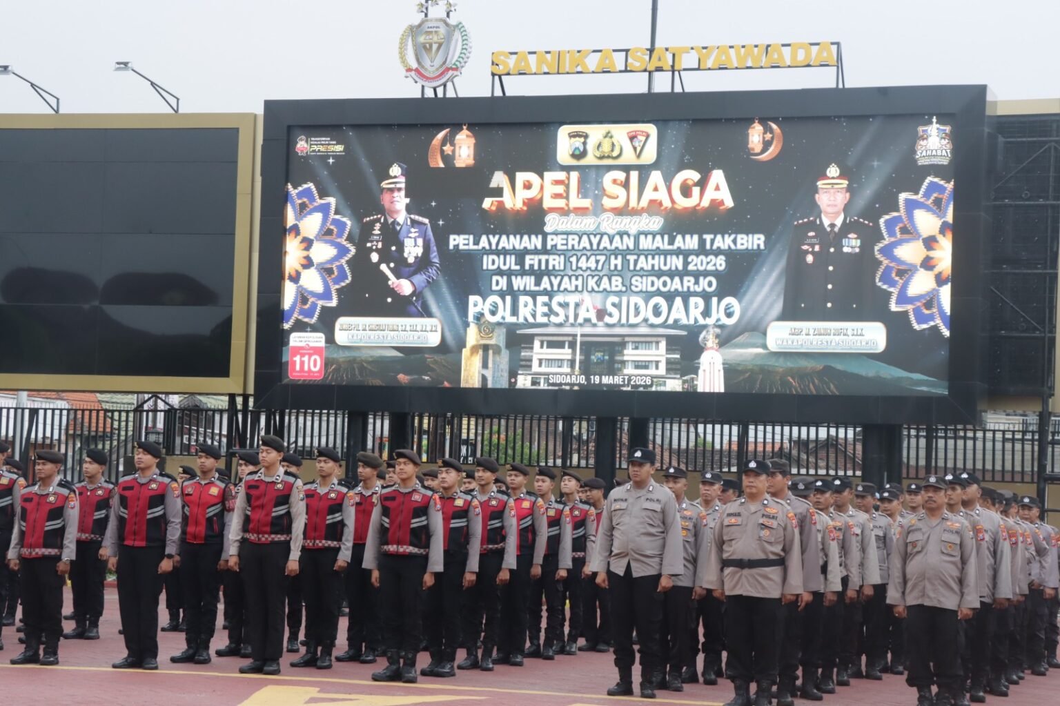 SURABAYAONLINE.CO – Untuk mengamankan dan memberikan kenyamanan masyarakat, dalam malam takbir Idul Fitri 1447 Hijriah, pada Kamis (19/3/2026), Polresta Sidoarjo menggelar apel siaga yang diikuti 857 personel gabungan.