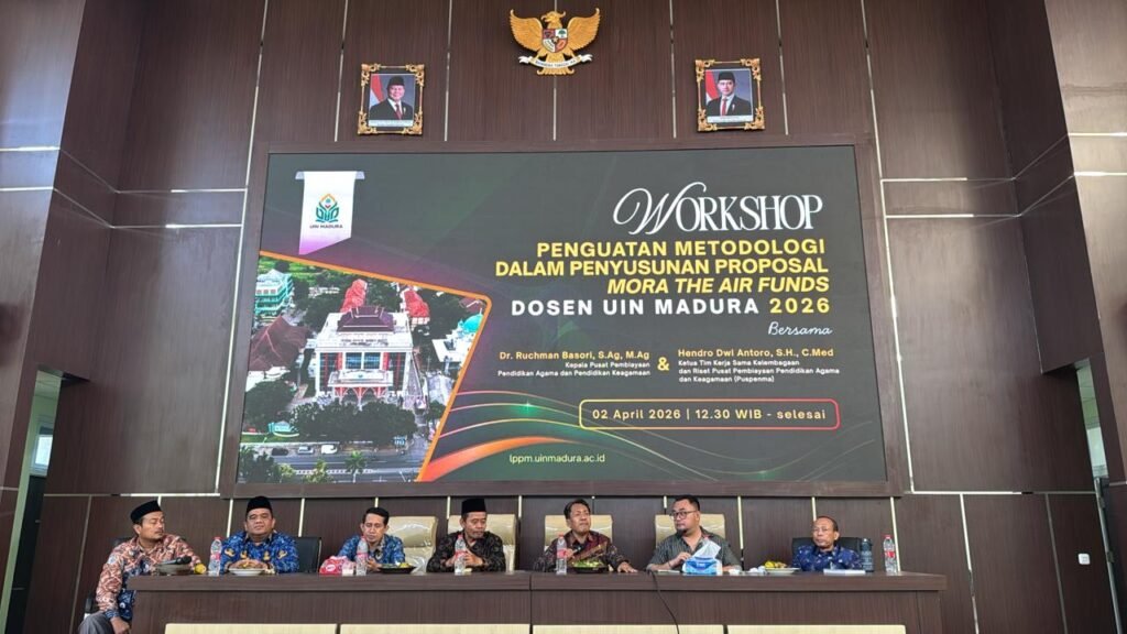 SURABAYAONLINE.CO – UIN Madura terus memperkuat komitmennya dalam membangun ekosistem riset yang unggul, kolaboratif, dan berdampak melalui penyelenggaraan Workshop Penyusunan Metodologi Proposal MoRA The Air Funds 2026 pada Kamis (2/4/2026) di Ballroom Lantai 4 UIN Madura. Kegiatan strategis ini dihadiri langsung oleh Rektor, Wakil Rektor, Ketua Lembaga, para dekan dan wakil dekan, ketua program studi, dosen lintas fakultas, serta Jabatan Fungsional Tertentu (JFT), dan disiarkan secara langsung melalui kanal YouTube MIUTV Official.