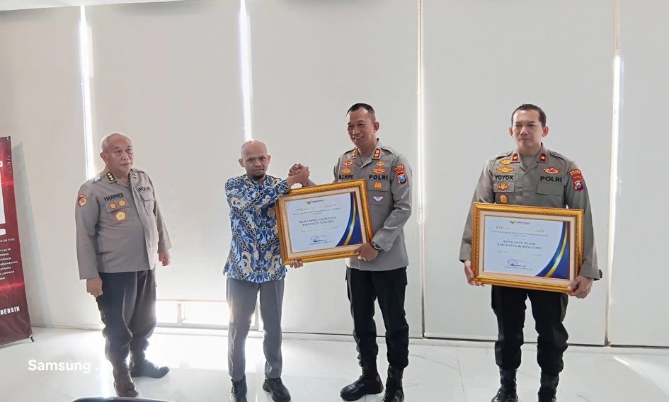 Penghargaan diserahkan oleh perwakilan Ombudsman RI Jawa Timur, Triyoga Muhtar Habibi, kepada Harries Budiharto dan Wakapolresta Sidoarjo AKBP Mohammad Zainur Rofik, Selasa (7/4/2026), di Ruang Biro Rena Polda Jawa Timur.