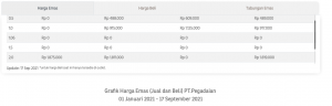 Diambil dari laman resmi pegadaian harga emas 24 karart UBS dengan ukuran 0,5 gram dijual seharga Rp 489.000, turun Rp 5.000 dilihat dari posisi terakhir, lalu untuk harga emas UBS dengan ukuran 1 gram dijual seharga Rp. 917.000 yang mengalami penuruan harga sampai Rp 8.000 dari harga kemarin sedangkan harga emas antam ukuran 0,5 dan 1 gram belum tersedia harganya pada laman pegadaian.